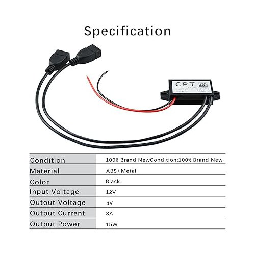 - 12V to 5V 3A DC Converter, Dual USB Adapter Converter Module, Waterproof DC to DC Reduced Voltage Regulator Step Down Power Supplement Module for Car, Motorcycle, etc.