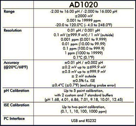 Benchtop Meter AD1020 is a professional pH, ORP (Oxidation Reduction Potential), ISE, and temperature meter. Relative mV readings are also provided. Made in Romania, Warranty: 1 Year