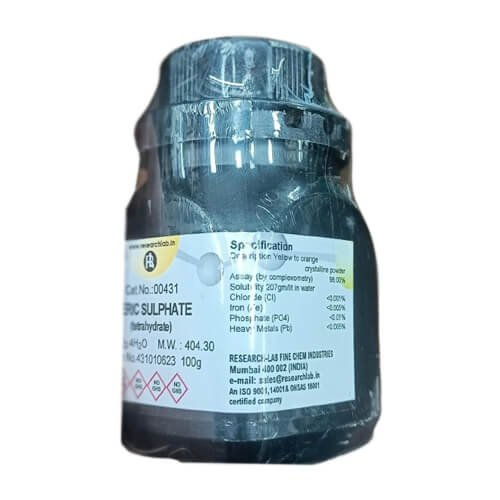 The Ceric Sulphate Tetrahydrate (100g) from ResearchLab India is a high-purity inorganic chemical widely used in analytical chemistry, research laboratories, and industrial applications. Known for its excellent oxidizing properties, this compound is ideal for titration, redox reactions, and other laboratory experiments requiring precision and reliability.