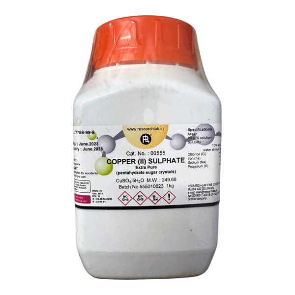 Buy Copper (II) Sulphate Pentahydrate 500g – Extra Pure (CuSO₄·5H₂O) from Research-Lab India. High-purity analytical reagent ideal for laboratory, industrial, and agricultural use. ISO-certified quality for accurate research and experiments.