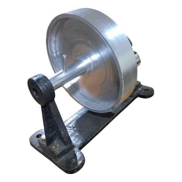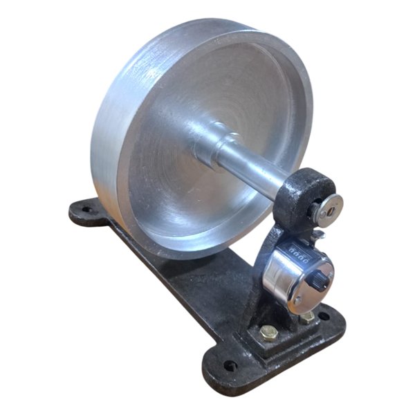 This apparatus consists of a solid metal flywheel mounted on a rigid base, supported by bearings for smooth rotation, and fitted with a mechanical revolution counter for accurate observation and measurement during experiments.
