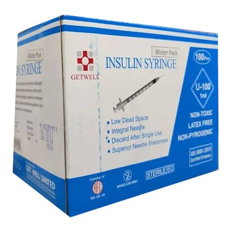 The Insulin Syringe 1mL 31G by Getwell is a high-quality, single-use syringe designed for precise insulin injection. Each box contains 100 syringes, making it ideal for diabetic patients, hospitals, and clinics. These syringes are designed to ensure comfort and safety during insulin administration, featuring low dead space, a superior integral needle, and latex-free, non-toxic material.