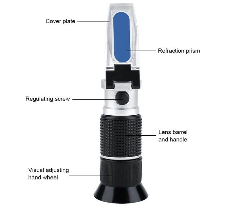 - Hand-held Refractometer, used to measure the density of sugars in the solution, the Brix scale range is 0 to 90%.